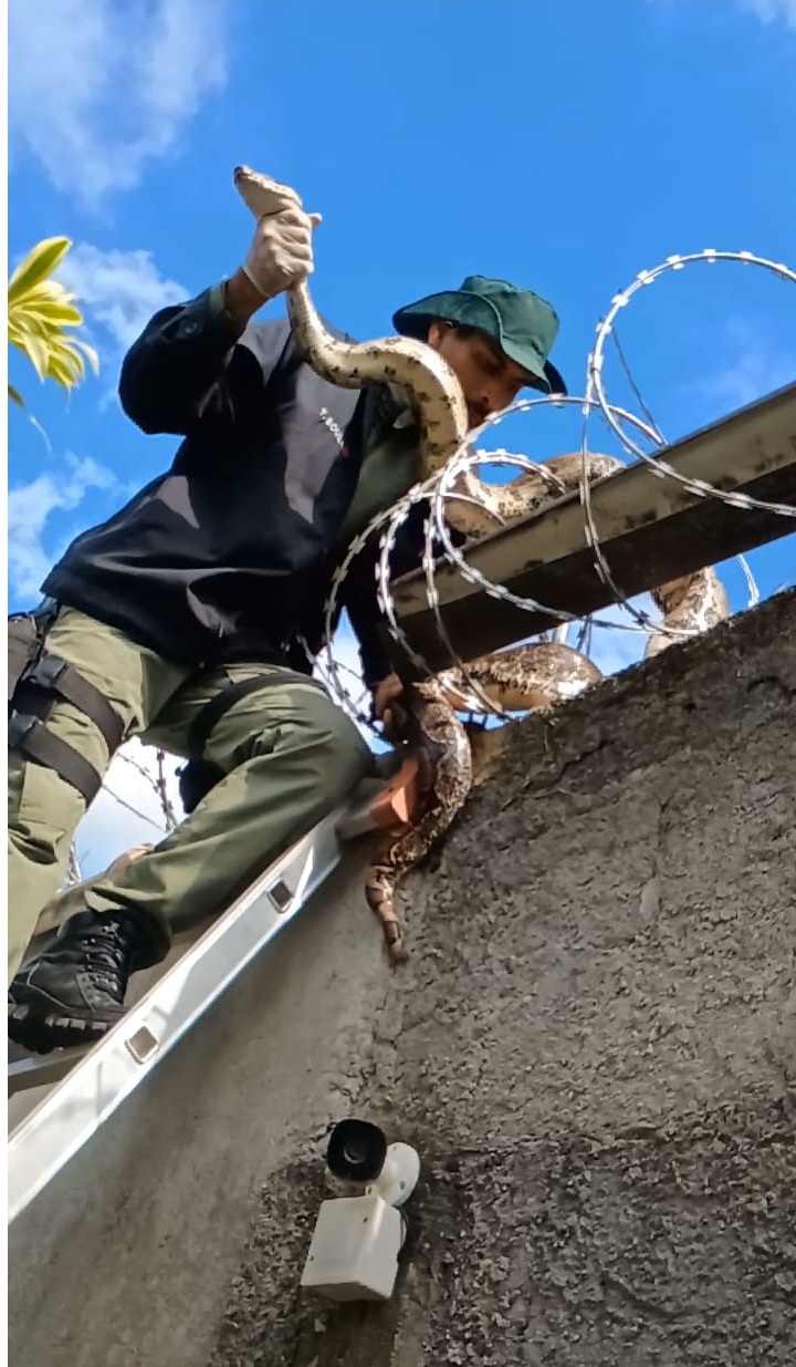 🚨 O bicho estava enrolado bem em cima do muro, perto das concertinas (aquelas cercas cortantes), e corria risco sério de se machucar. A operação exigiu cuidado redobrado da equipe da Coordenadoria de Meio Ambiente da Guarda Municipal, que foi até o local e fez o resgate com segurança.